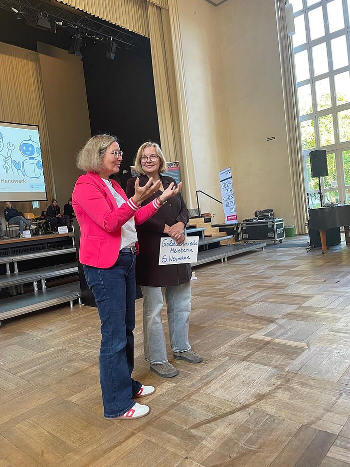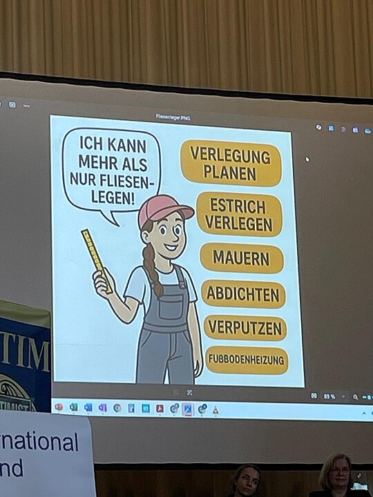 Acht Handwerkerinnen aus verschiedenen Gewerken( Fliesen, Steinmetz, Konditorei, Goldschmiede, Mechatronik, Tischlerei und Schreinerei) haben kurzweilig und spannend ihre Berufe, Ausbildung und persönliche Lebenswege vorgestellt. Kurze Filme, Bilder, Clips und Werkzeuge haben die Veranstaltung für die Schülerinnen bereichert.